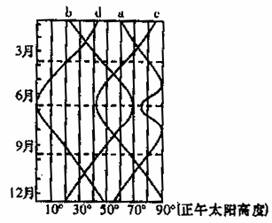 下图中a、b、c、d四条曲线,分别表示甲、乙、丙、丁四个地点正午太阳高度的季节变化状况,回答3-4题。