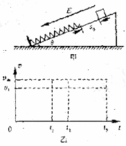 (3)从滑块静止释放瞬间开始计时,请在乙图中画出滑块在沿斜面向下运动的整个过程中速度与时间关系v-t图象。图中横坐标轴上的t1、t2及t3分别表示滑块第一次与弹簧上端接触、第一次速度达到最大值及第一次速度减为零的时刻,纵坐标轴上的v1为滑块在t1时刻的速度大小,vm是题中所指的物理量。(本小题不要求写出计算过程)