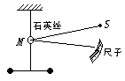 卡文迪许扭秤是用来测定万有引力恒量的重要仪器,为了观察悬挂的石英丝发生的微小扭转形变,卡文迪许采用了光放大的原理,图中悬挂在石英丝下端的T形架的竖直杆上装一块小平面镜M,M可将由光源S射来的光线反射到弧形的刻度尺上(圆弧的圆心即在M处)。已知尺距M为2m,若反射光斑在尺S上移动2cm,则平面镜M转过的角度是________rad。