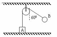 如图所示,一光滑的定滑轮通过一轻绳系住两物体A、B。A重200N,B重100N。B摆到最高点时,绳子与竖直方向夹角为600,求物体A在B摆到最高点时对地面的压力。