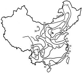 2009年2月6日来自中国气象局的消息,由降水异常偏少和平均气温较常年同期偏高导致的气象干旱已波及中国12个省份,北方冬麦区旱情为30年一遇,读我国部分地区干旱总次数等值线图(1951-1991年),回答1-4题。