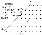 [07广东]如图是某装置的垂直截面图,虚线A1A2是垂直截面与磁场区边界面的交线,匀强磁场分布在A1A2的右侧区域,磁感应强度B=0.4T,方向垂直纸面向外,A1A2与垂直截面上的水平线夹角为45°。在A1A2左侧,固定的薄板和等大的挡板均水平放置,它们与垂直截面交线分别为S1、S2,相距L=0.2 m。在薄板上P处开一小孔,P与A1A2线上点D的水平距离为L。在小孔处装一个电子快门。起初快门开启,一旦有带正电微粒刚通过小孔,快门立即关闭,此后每隔T=3.0×10-3 s开启一次并瞬间关闭。从S1S2之间的某一位置水平发射一速度为v0的带正电微粒,它经过磁场区域后入射到P处小孔。通过小孔的微粒与档板发生碰撞而反弹,反弹速度大小是碰前的0.5倍。
