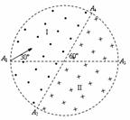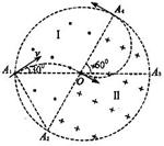 [05广东]如图所示,在一个圆形区域内,两个方向相反且都垂直于纸面的匀强磁场分布在以直径A2A4为边界的两个半圆形区域Ⅰ、Ⅱ中,A2A4与A1A3的夹角为60º。一质量为m、带电量为+q的粒子以某一速度从Ⅰ区的边缘点A1处沿与A1A3成30º角的方向射入磁场,随后该粒子以垂直于A2A4的方向经过圆心O进入Ⅱ区,最后再从A4处射出磁场。已知该粒子从射入到射出磁场所用的时间为t,求Ⅰ区和Ⅱ区中磁感应强度的大小(忽略粒子重力)。