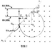 ⑵设微粒在磁场中做圆周运动的周期为T0,从水平进入磁场到第二次离开磁场的总时间为t,设t1、t4分别为带电微粒第一次、第二次在磁场中运动的时间,第一次离开磁场运动到挡板的时间为t2,碰撞后再返回磁场的时间为t3,运动轨迹如答图2所示,则有: