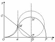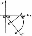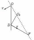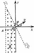 解: (1)质点在磁场中的轨迹为一圆弧。由于质点飞离磁场时,速度垂直于OC,故圆弧的圆心在OC上。依题意,质点轨迹与x轴的交点为A,过A点作与A点的速度方向垂直的直线,与OC交于O'。由几何关系知,AO'垂直于OC',O'是圆弧的圆心。设圆弧的半径为R,则有 R=dsinj ①