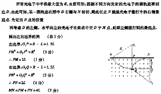 [08福州市质检(改动)]如图所示,用波λ为A的强光照射金属板A(板的大小可忽略),金属板A发生了光电效应.金属板A的周围有垂直纸面向里的匀强磁场,磁感应强度为B,范围足够大,距A板正上方L处有一涂有荧光材料的金属条D并与A平行。金属条D受到光电子的冲击而出现荧光的部分集中在MN间(MN未标出),已知光电子质量为m,电量为e,光速为c,若金属板A只有上表面能向各个方向逸出不同速度的光电子,光电子在磁场中运动的最大半径R=2.5L,金属条D出现荧光的部分MN的长度是多少?