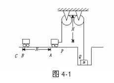 (★★★★)一辆车通过一根跨过定滑轮的绳PQ提升井中质量为m的物体,如图4-1所示.绳的P端拴在车后的挂钩上.设绳的总长不变,绳的质量、定滑轮的质量和尺寸、滑轮上的摩擦都忽略不计.开始时,车在A点,左右两侧绳都已绷紧并且是竖直的,左侧绳长为H.提升时,车向左加速运动,沿水平方向从A经过B驶向C.设A到B的距离也为H,车过B点时速度为vB.求车由A移到B的过程中,绳Q端的拉力对物体做的功是多少?