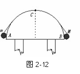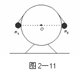 4.(★★★★)如图2-11所示,半径为R的光滑圆柱体,由支架固定于地面上,用一条质量可以忽略的细绳,将质量为m1和m2的两个可看作质点的小球连接,放在圆柱体上,两球和圆心O在同一水平面上,在此位置将两物体由静止开始释放,问在什么条件下m2能通过圆