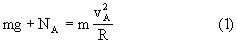 ,式中,NA为圆形轨道对小球的弹力。上式表示小球在A点作圆周运动所需要的向心力由轨道对它的弹力和它本身的重力共同提供。当NA=0时,vA最小,vA=
