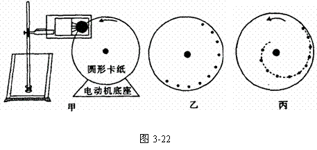 例10: 图3-22甲所示为测量电动机转动角速度的实验装置,半径不大的圆形卡纸固定在电动机转轴上,在电动机的带动下匀速转动.在圆形卡纸的旁边垂直安装一个改装了的电火花计时器。