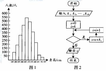 内的人数]。图2是统计图1中身高在一定范围内学生人数的一个算法流程图。现要统计身高在160~180cm(含160cm,不含180cm)的学生人数,那么在流程图中的判断框内应填写的条件是