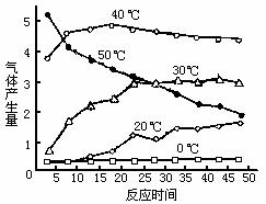 32.(上海生物)下图表示不同温度下酵母菌发酵时气体产生量与反应时间的关系。由图可知