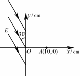 [例3]在如图所示的空间区域里,y轴左方有一匀强电场,场强方向跟y轴负方向成30°角,大小为E = 4.0×105N/C,y轴右方有一垂直纸面的匀强磁场,有一质子以速度υ0 = 2.0×106m/s由x轴上A点(OA = 10cm)第一次沿轴正方向射入磁场,第二次沿x轴负方向射入磁场,回旋后都垂直射入电场,最后又进入磁场,已知质子质量m为1.6×10-27kg,求: