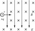空间存在相互垂直的匀强电场E和匀强磁场B,其方向如图所示.一带电粒子+q以初速度υ0垂直于电场和磁场射入,则粒子在场中的运动情况可能是 ( AD )