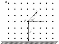 (2)若某时刻微粒运动到场中距地面高度为H的P点,速度与水平方向成45°,如图所示.则该微粒至少须经多长时间运动到距地面最高点?最高点距地面多高?