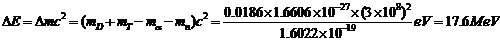 例:一个氘核和一个氚核发生聚变,其核反应方程是21H+31H→42He+10n,其中氘核的质量:mD=2.014 102 u、氚核的质量:mT=3.016 050 u、氦核的质量:mα=4.002 603 u、中子的质量:mn=1.008 665 u、1u