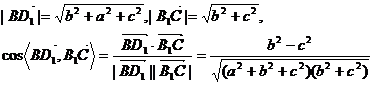 例4 在长方体ABCD-A1B1C1D1中,AB=a,BC=b,AA1=c,求异面直线BD1和B1C所成角的余弦值![]()
