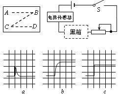 [例2](连云港、淮安、宿迁三市2008届高考模拟考试)某一电学黑箱内可能有电容器、电感线圈、定值电阻等元件,在接线柱间以如图所示的“Z”字形连接(两接线柱间只有一个元件)。为了确定各元件种类,小华同学把DIS计算机辅助实验系统中的电流传感器(相当于电流表)与一直流电源、滑动变阻器、开关串联后,分别将AB、BC、CD接入电路,闭合开关,计算机显示的电流随时间变化的图象分别如图a、b、c所示,则如下判断中正确的是( )