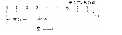 “第4秒内”、“前2秒内”都是指时间间隔。其中“第4秒内”就是“第4秒初”(或“第3秒末”)到“第4秒末”这两个时刻之间的时间间隔,时间长度为1秒,在时间轴上指t=3 s到t=4 s两点间的时间间隔。
