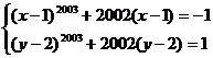 解:构造函数f(t)=t2003+2002t,易知f(t)是R上的奇函数也是单调函数,由此可得:f(x-1)= -f(y-2),∴f(x-1)=f(2-y),∴x-1=2-y,∴x+y=3。