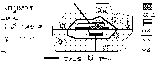 读某城市略图和该城市各地2004年人口变动示意图,回答下列问题。(6分)