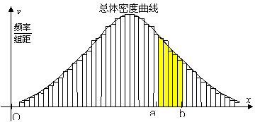 它反映了总体在各个范围内取值的概率.根据这条曲线,可求出总体在区间(a,b)内取值的概率等于该区间上总体密度曲线与x轴、直线x=a、x=b所围成曲边梯形的面积。