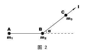 物理情形:三个质点A、B和C ,质量分别为m1 、m2和m3 ,用拉直且不可伸长的绳子AB和BC相连,静止在水平面上,如图2所示,AB和BC之间的夹角为(π-α)。现对质点C施加以冲量I ,方向沿BC ,试求质点A开始运动的速度。![]()