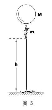 (学生活动)思考:如图5所示,在无风的天空,人抓住气球下面的绳索,和气球恰能静止平衡,人和气球地质量分别为m和M ,此时人离地面高h 。现在人欲沿悬索下降到地面,试问:要人充分安全地着地,绳索至少要多长?