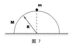 进阶应用:如图7所示,一个质量为M ,半径为R的光滑均质半球,静置于光滑水平桌面上,在球顶有一个质量为m的质点,由静止开始沿球面下滑。试求:质点离开球面以前的轨迹。