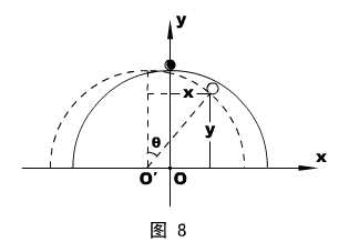 由于质点相对半球总是做圆周运动的(离开球面前),有必要引入相对运动中半球球心O′的方位角θ来表达质点的瞬时位置,如图8所示。