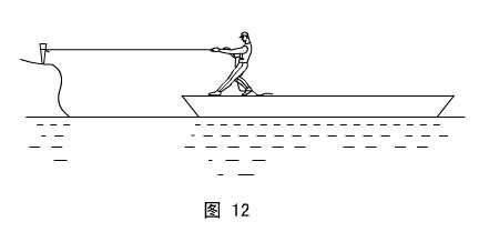 (学生活动)思考:如图12所示,人站在船上,通过拉一根固定在铁桩的缆绳使船靠岸。试问:缆绳是否对船和人的系统做功?