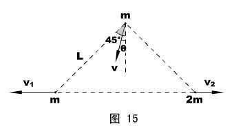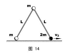 物理情形:如图14所示,两根长度均为L的刚性轻杆,一端通过质量为m的球形铰链连接,另一端分别与质量为m和2m的小球相连。将此装置的两杆合拢,铰链在上、竖直地放在水平桌面上,然后轻敲一下,使两小球向两边滑动,但两杆始终保持在竖直平面内。忽略一切摩擦,试求:两杆夹角为90°时,质量为2m的小球的速度v2 。
