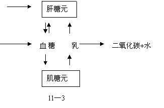 糖元是由许许多多葡萄糖组成的大分子多糖,它微溶于水,能通过氧化分解或酵解而迅速释放能量。糖元除由葡萄糖合成以外,其他单糖如果糖、半乳糖等也能合成。由单糖合成糖元的过程,就叫糖元的合成。糖元的合成,主要在肝脏和肌肉中进行。糖元还可以由非糖物质如甘油、丙酮酸、乳酸、某些氨基酸等转变而成。由非糖物质转变成糖元的过程,就叫糖元的异生作用。糖元的异生作用发生在肝脏中,上述两个过程可以图解11-3如下: