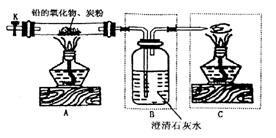 ⑵在A中硬质玻璃管内装入该铅的氧化物和炭粉混合 物,B中洗气瓶内装入足量澄清石灰水。依次点燃A、C两处酒精灯。