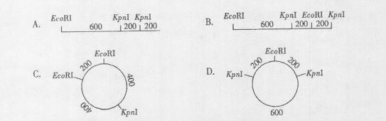 25.现有一长度为1000碱基对(bp)的DNA分子,用限制性核酸内切酶EcoRl酶切后得到的DNA分子仍是1000 bp,用Kpnl单独酶切得到400 bp和600 bp两种长度的DNA分子,用EcoRI、Kpnl同时酶切后得到200 bp和600 bp两种长度的DNA分子。该DNA分子的酶切图谱正确的是 ( )