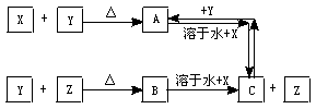 20. 有X、Y、Z三种单质,常温下X是固体,Y是液体,Z是气体。其反应关系为下框图。