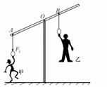 (2009年泰安市)两位同学利用左下图所示的可以绕O点自由转动的健身器材进行锻炼,甲同学竖直向下用力F1将另一端的乙同学拉起。请画出拉力F1的力臂L1。