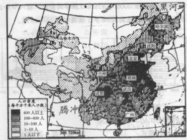 读“中国人口分布图”,完成10-12