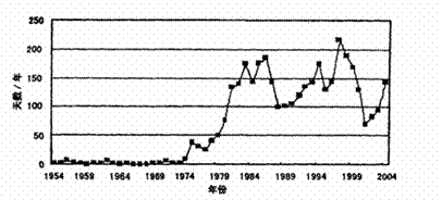 灰霾是指空气悬浮着大量极细微的干尘粒等颗粒物,能见度小于10公里的大气现象。近年来珠江三角洲及国内一些区域,因空气质量差,灰霾现象严重,引起了人们广泛的关注。读“广州灰霾天数1954-2004年逐年变化图”,回答15-16题。