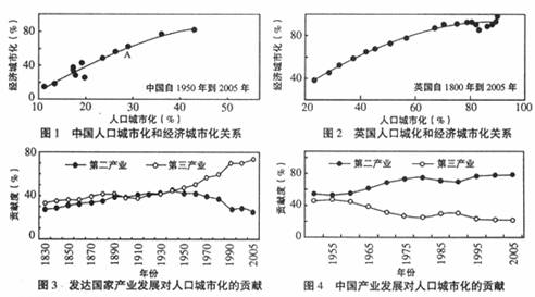 (1) 读图1中A点可知,在某一历史肘期,我国经济城市化、人口城市化水平分别约为 %和 %。由趋势线可见,我国现代城市化过程中,经济城市化水平与人口城市化水平相比,发展水平较高的是 。