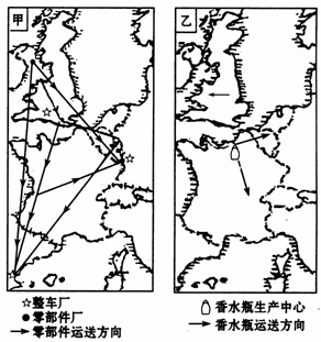 (1)甲图中整车厂所在3个国家分别是英国、 、 ;乙图中香水瓶生产中心所在的国家是 。