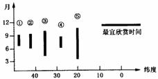 读我国山水风景区最宜欣赏时间与纬度关系图,回答8-9题:![]()