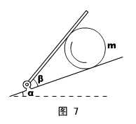 1、如图7所示,在固定的、倾角为α斜面上,有一块可以转动的夹板(β不定),夹板和斜面夹着一个质量为m的光滑均质球体,试求:β取何值时,夹板对球的弹力最小。![]()