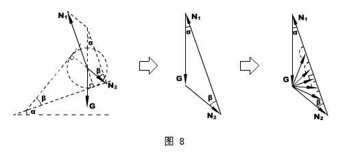 由于G的大小和方向均不变,而N1的方向不可变,当β增大导致N2的方向改变时,N2的变化和N1的方向变化如图8的右图所示。![]()