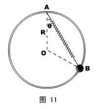 3、如图11所示,一个重量为G的小球套在竖直放置的、半径为R的光滑大环上,另一轻质弹簧的劲度系数为k ,自由长度为L(L<2R),一端固定在大圆环的顶点A ,另一端与小球相连。环静止平衡时位于大环上的B点。试求弹簧与竖直方向的夹角θ。![]()