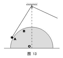 (学生活动)反馈练习:光滑半球固定在水平面上,球心O的正上方有一定滑轮,一根轻绳跨过滑轮将一小球从图13所示的A位置开始缓慢拉至B位置。试判断:在此过程中,绳子的拉力T和球面支持力N怎样变化?![]()