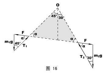 4、两根等长的细线,一端拴在同一悬点O上,另一端各系一个小球,两球的质量分别为m1和m2 ,已知两球间存在大小相等、方向相反的斥力而使两线张开一定角度,分别为45和30°,如图15所示。则m1 : m2为多少?