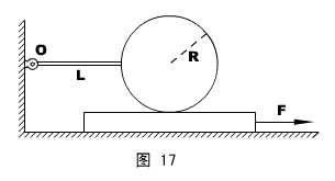 5、如图17所示,一个半径为R的均质金属球上固定着一根长为L的轻质细杆,细杆的左端用铰链与墙壁相连,球下边垫上一块木板后,细杆恰好水平,而木板下面是光滑的水平面。由于金属球和木板之间有摩擦(已知摩擦因素为μ),所以要将木板从球下面向右抽出时,至少需要大小为F的水平拉力。试问:现要将木板继续向左插进一些,至少需要多大的水平推力?