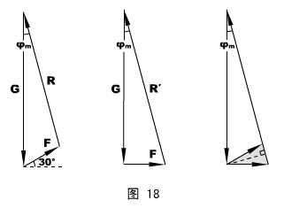 引进全反力R ,对物体两个平衡状态进行受力分析,再进行矢量平移,得到图18中的左图和中间图(注意:重力G是不变的,而全反力R的方向不变、F的大小不变),φm指摩擦角。