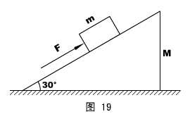 2、如图19所示,质量m = 5kg的物体置于一粗糙斜面上,并用一平行斜面的、大小F = 30N的推力推物体,使物体能够沿斜面向上匀速运动,而斜面体始终静止。已知斜面的质量M = 10kg ,倾角为30°,重力加速度g = 10m/s2 ,求地面对斜面体的摩擦力大小。